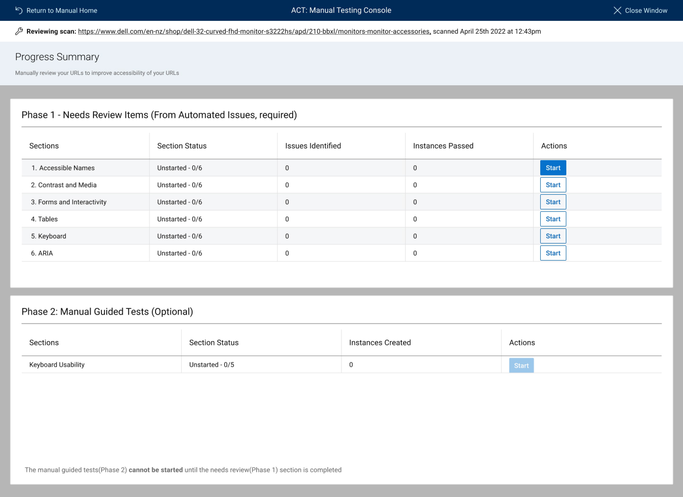 This section is step by step guidance for issues that need to be manually checked, such as keyboard accesibility.