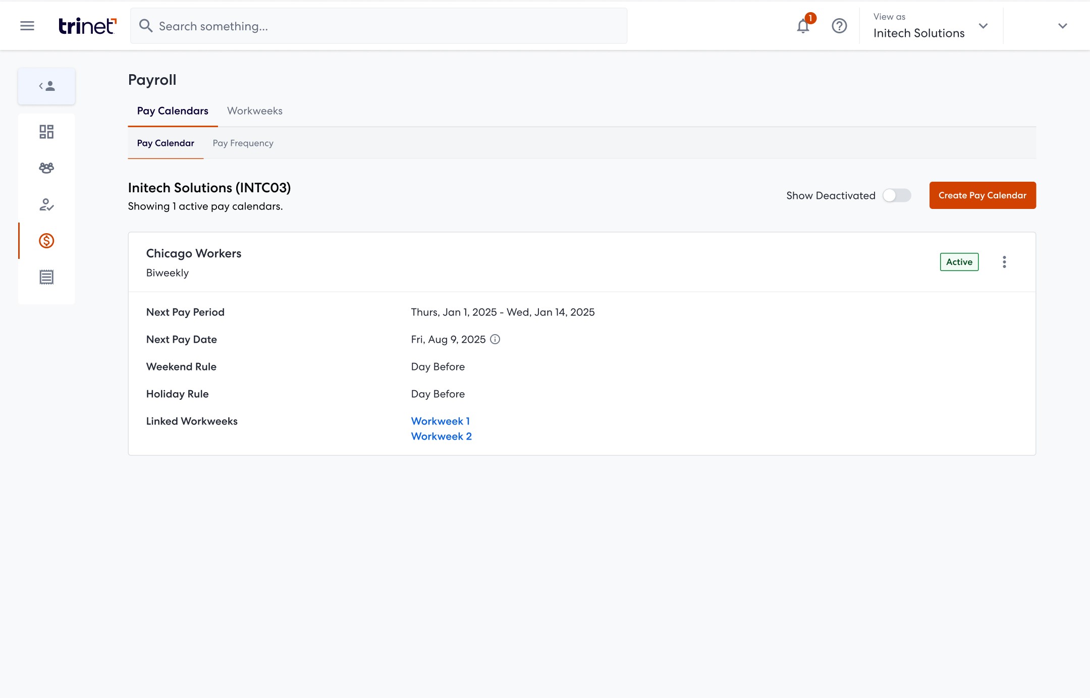 Admins can view existing pay calendars, track upcoming pay periods, and create new calendars from a single entry point.