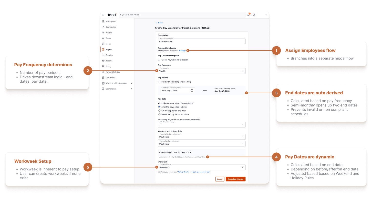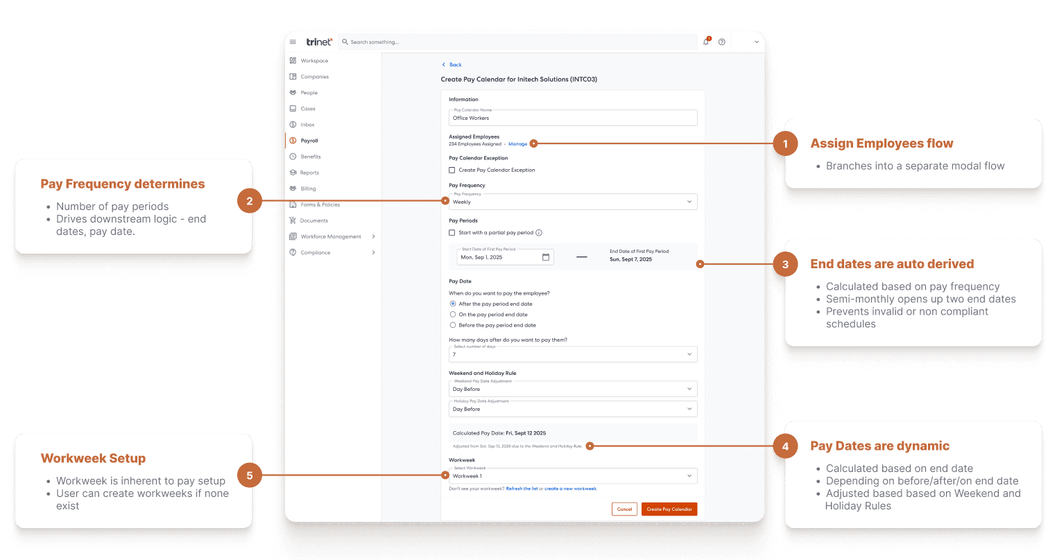 This project focused on redesigning Pay Calendars as part of TriNet’s transition away from PeopleSoft. Previously, payroll schedules were configured through legacy systems and manual processes, making them difficult to understand, update, and validate.